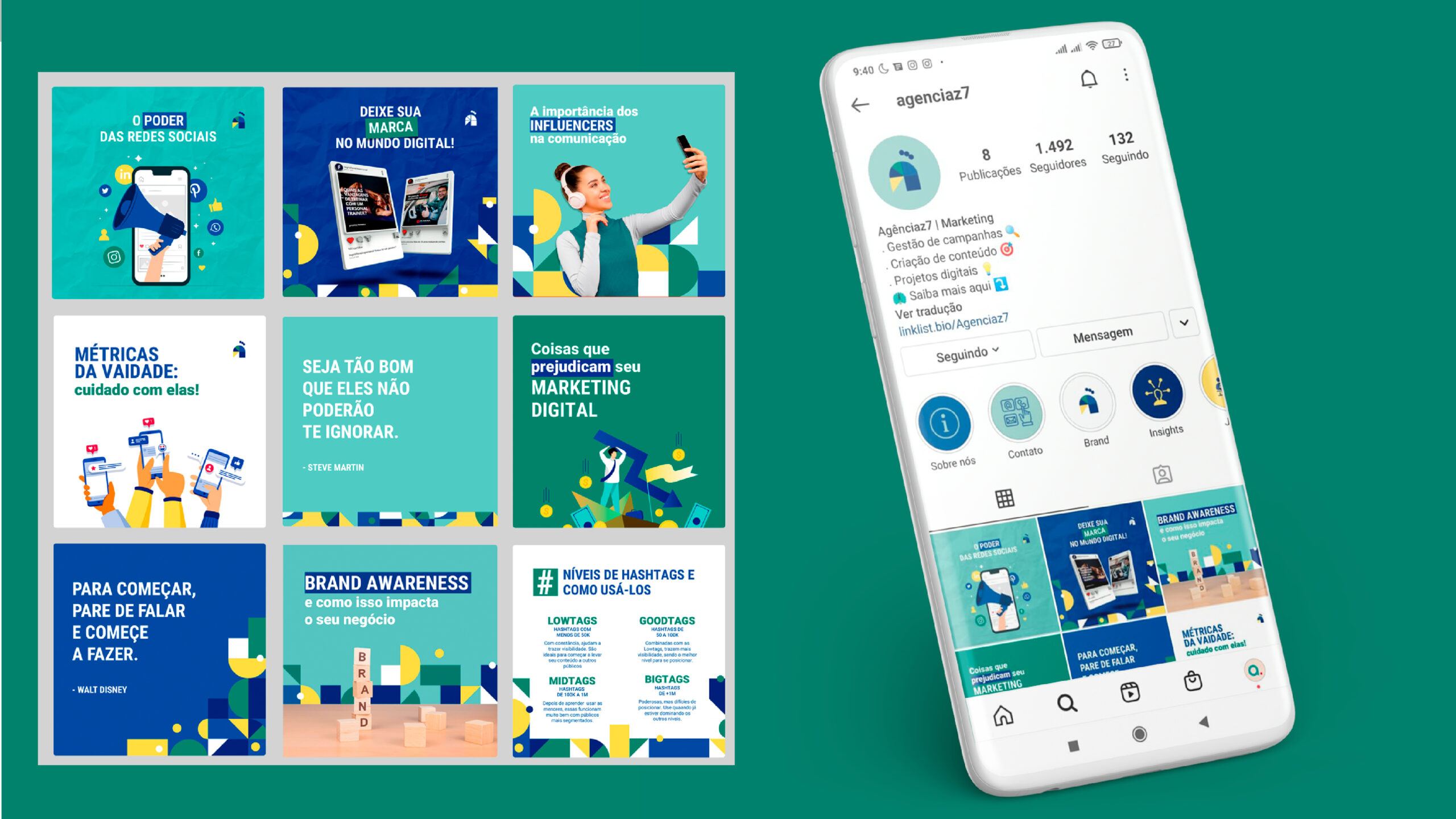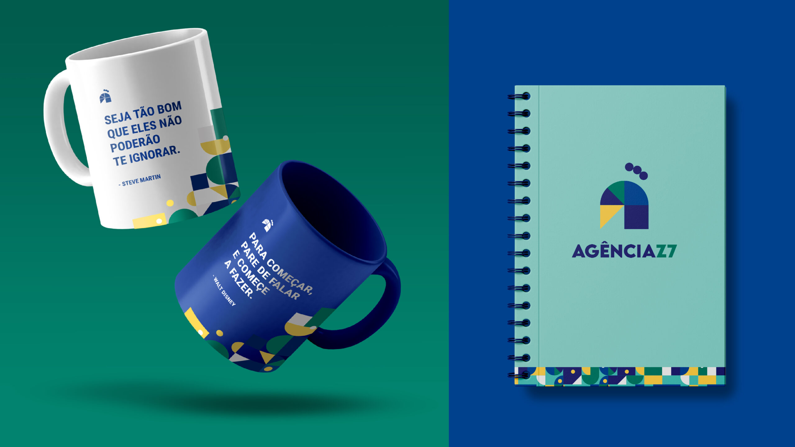 Neste trabalho de identidade visual para agência de marketing digital, foram sugeridas pelo cliente as cores azul e amarelo. Sendo essas duas muito usadas pela indústria e empresas mais tradicionais, resolvi seguir uma direção diferente.